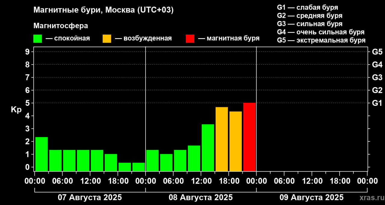 Магнитная буря чуть запоздала: ее прогнозировали днем 8 августа, а началась она в ночь на 9-е.
