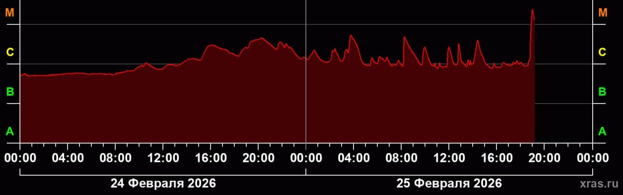 А вечером 25 февраля случилась самая сильная за последние две недели вспышка класса М. Это значит, что ледниковый период нам не грозит, но зато вполне могут случиться магнитные бури.