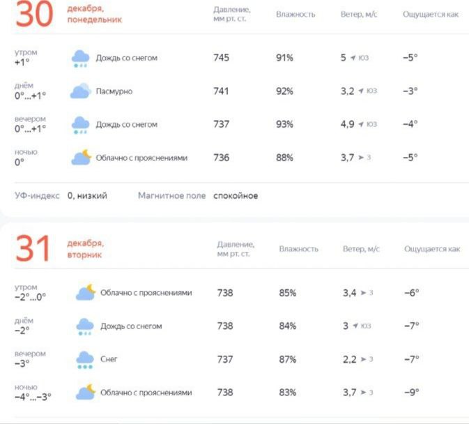 Плюсовая температура сохранится и в понедельник, 30 декабря. Весь день показатели ртутных столбиков будут колебаться от 0 до +1 градуса. Однако вместо солнца костромичей ждет дождь со снегом. Юго-западный ветер усилится до 4,9 метра в секунду, создавая ощущение, что на улице холоднее — примерно -4 градуса.