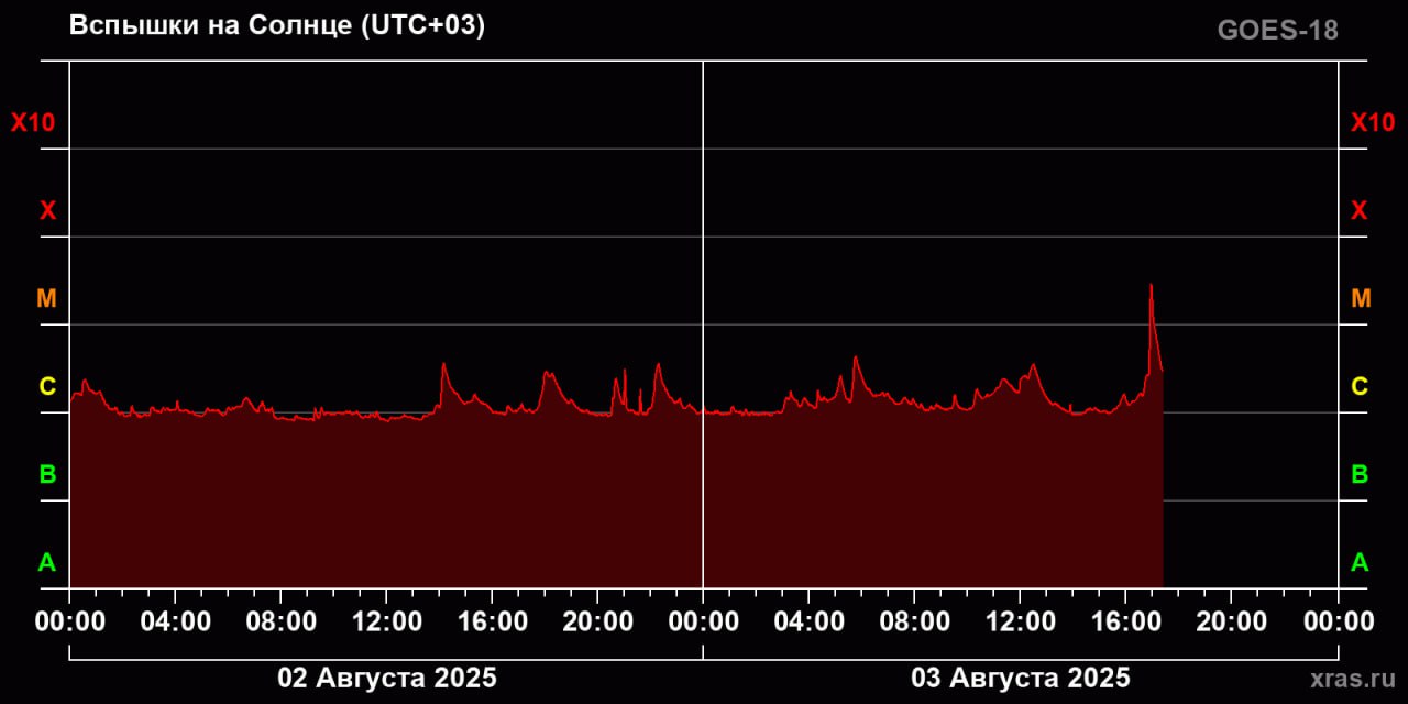 Ее пик пришелся на 16:57 по московскому времени. Всплеск солнечной активности начался раньше — 1 августа.
