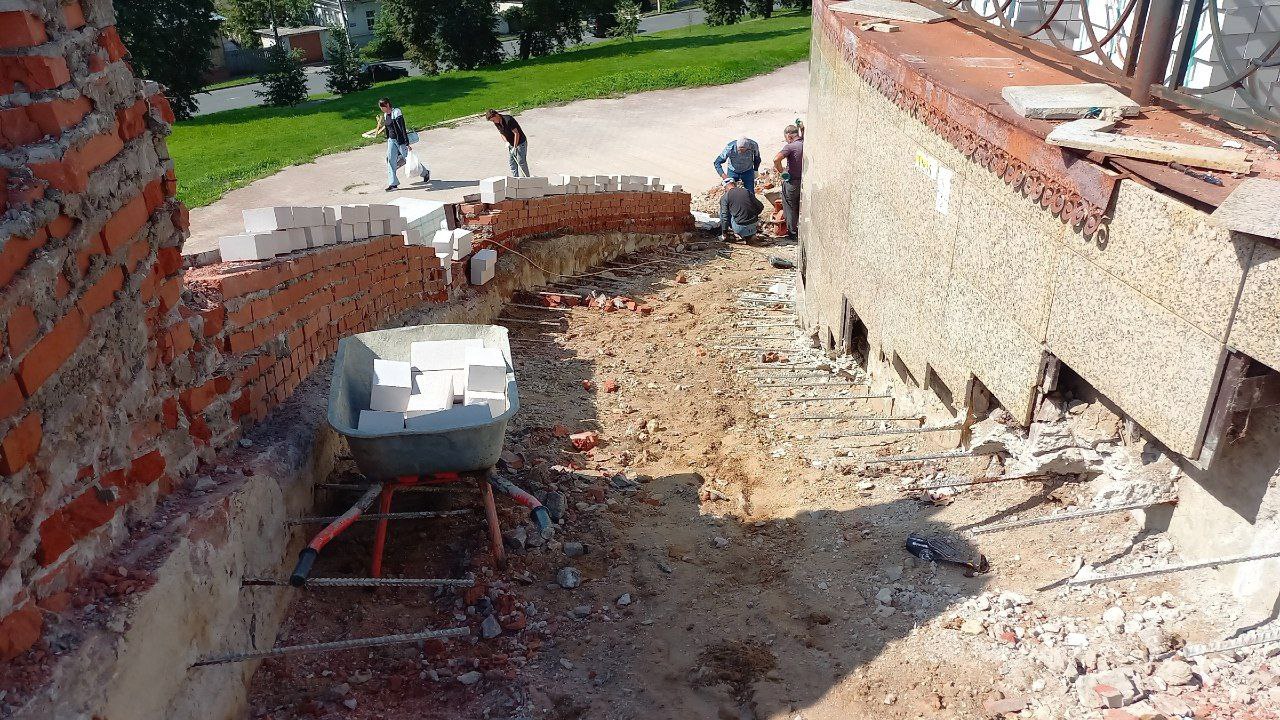 В настоящий момент специалисты занимаются разборкой столбов ограждений, а на парапете снимают кладку и облицовочную плитку. Пока подрядчик «реанимирует» только одну лестницу, так как работы трудозатратные. На объекте уже произведен демонтаж, в результате которого стало ясно, что основание полностью разрушено. Его планируют восстановить из прочного и влагостойкого бетона. Перед заливкой материал проверят в лаборатории.