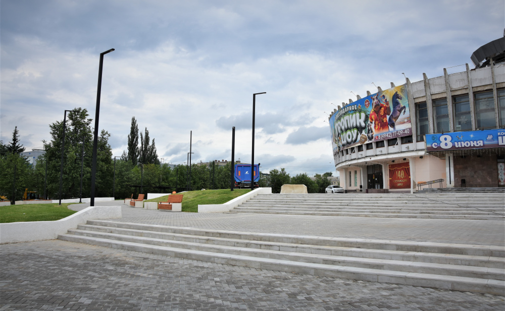 В ближайшее время подрядчик приступит к асфальтированию территорий у входа в цирк и в парк со стороны улицы Маршала Новикова. Еще остается установка ограждения на подпорной стенке и пандусах, а также малых архитектурных форм.