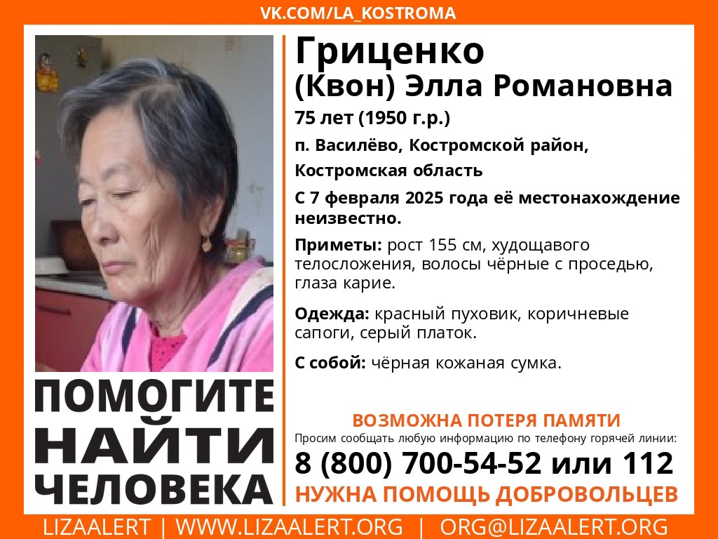 75-летняя Элла Гриценко (Квон) ушла из дома в поселке Василево Костромского района 7 февраля.