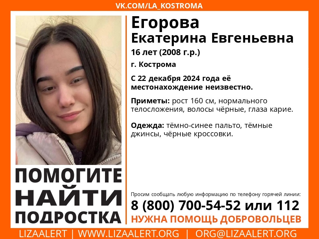 Екатерина Егорова около двух часов дня 22 декабря ушла на учебу и не вернулась.