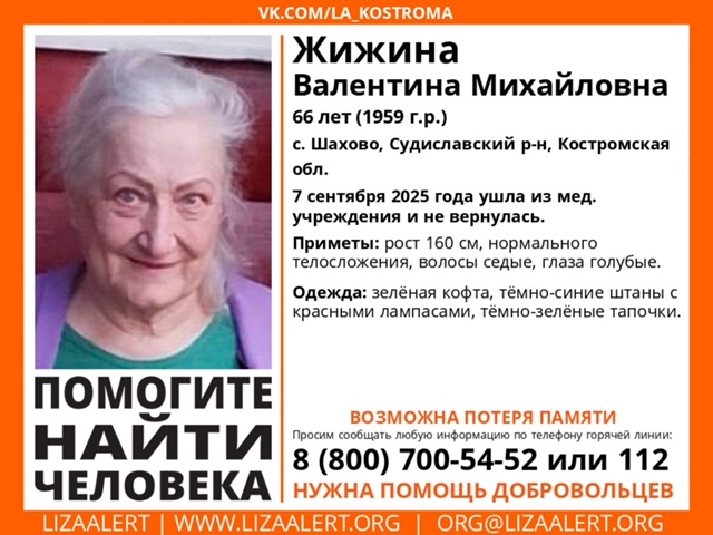 66-летняя Валентина Жижина из села Шахово Судиславского района пропала 7 сентября.