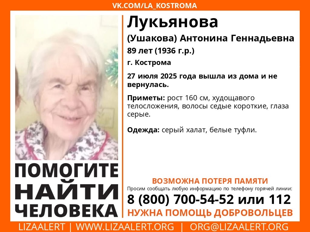 89-летняя Антонина Геннадьевна Лукьянова (Ушакова) ушла из дома 27 июля и не вернулась.
