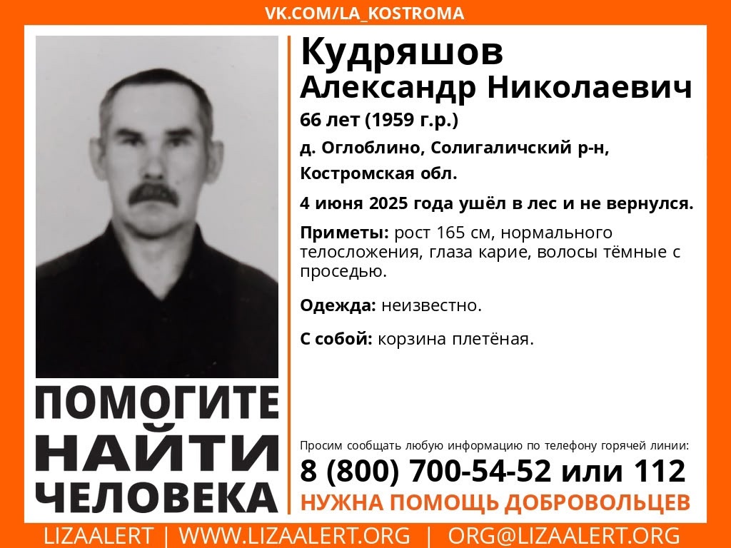 66-летний Александр Кудряшов ушел в лес из деревни Оглоблино Солигаличского района 4 июня.