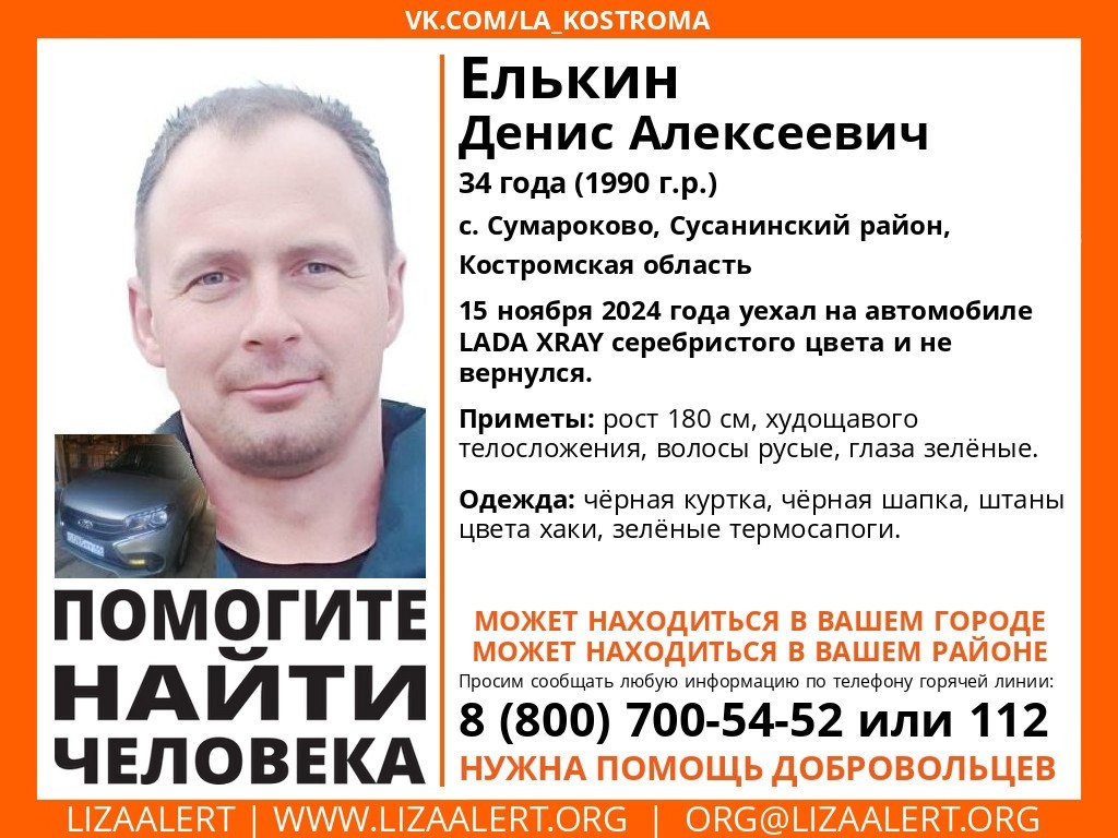 34-летний житель села Сумароково Сусанинского района Денис Елькин 15 ноября 2024 года уехал на автомобиле LADA XRAY серебристого цвета и не вернулся.