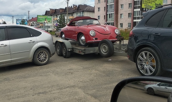 Машинку перевозили на прицепе. Местные жители узнали в симпатичном автомобиле Porsche speedster (Порше Спидстер).