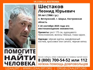 59-летний житель Шарьи Леонид Шестаков пропал еще 24 сентября. Известны приметы мужчины: рост 175 см, нормального телосложения, волосы темные, глаза…