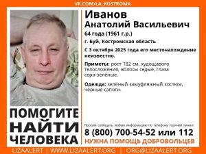64-летний житель Буя Анатолий Иванов пропал 3 октября. Его разыскивают полиция и волонтеры Лиза Алерт. Приметы мужчины: рост 182 см,…