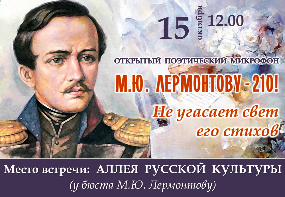 15 октября, в честь юбилейной даты — 210-летия со дня рождения поэта, драматурга, прозаика, переводчика, художника Михаила Юрьевича Лермонтова муниципальные библиотеки приглашают всех желающих принять участие в открытом поэтическом микрофоне «М. Ю. Лермонтову – 210! Не угасает свет его стихов».