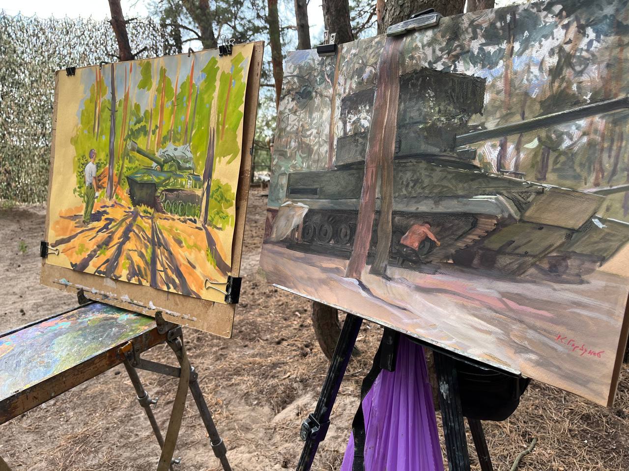 Мастера живописи Олег Поляков, Константин Горбунов и Александр Королев ранее побывали в зоне СВО в феврале, а сейчас вновь создают полотна в расположении 1065 артполка.