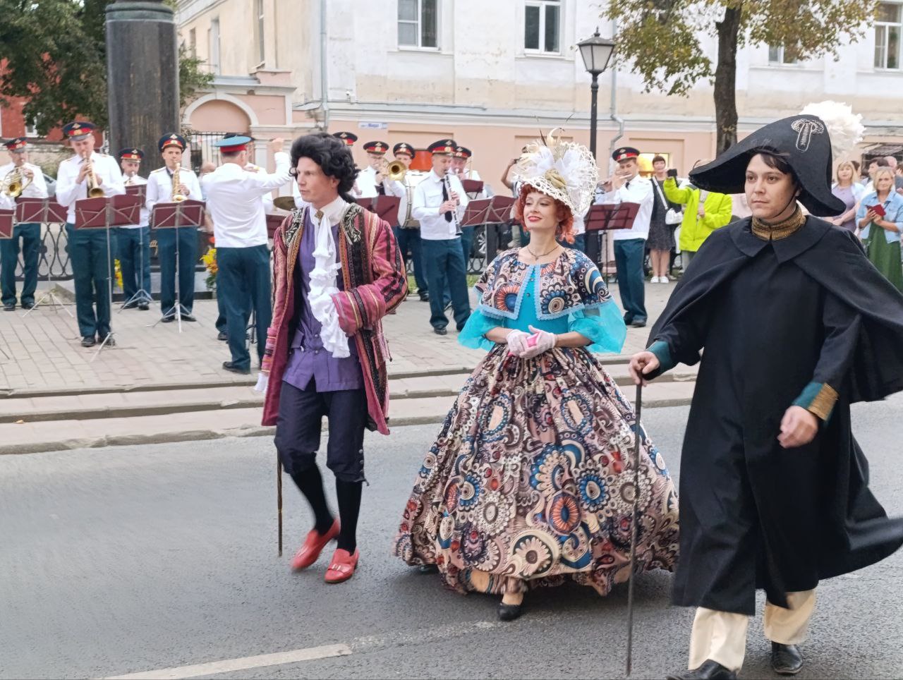 Погода не подвела, поэтому и запланированное дефиле дам в кринолинах под руку с кавалерами состоялось на аллее у театра.