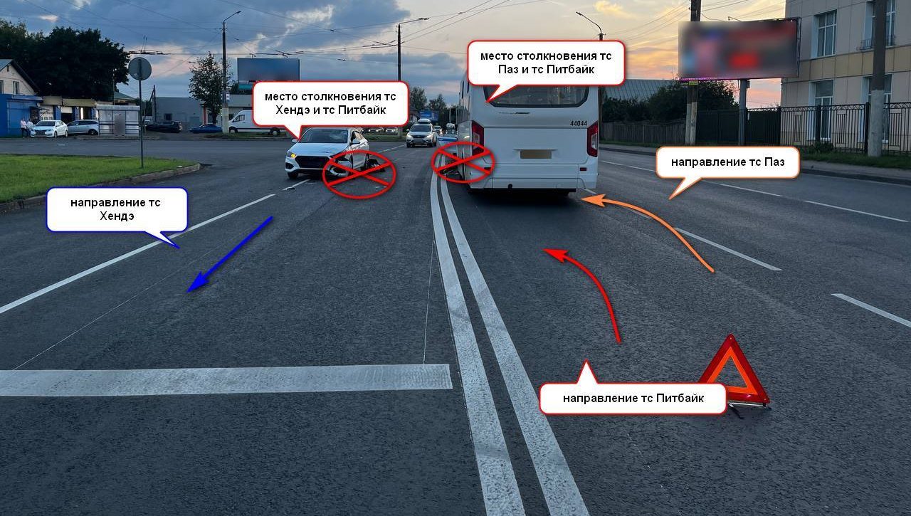 14 августа в 19.10 минут в г. Костроме на ул. Северной правды 16-летний подросток на питбайке «Yamma» при повороте налево через двойную сплошную линию разметки не предоставил преимущество в движении и столкнулся с иномаркой «Хендай Солярис» под управлением 28-летнего молодого человека. От удара питбайк отбросило на автобус городского маршрута, которым управлял 43-летний водитель.