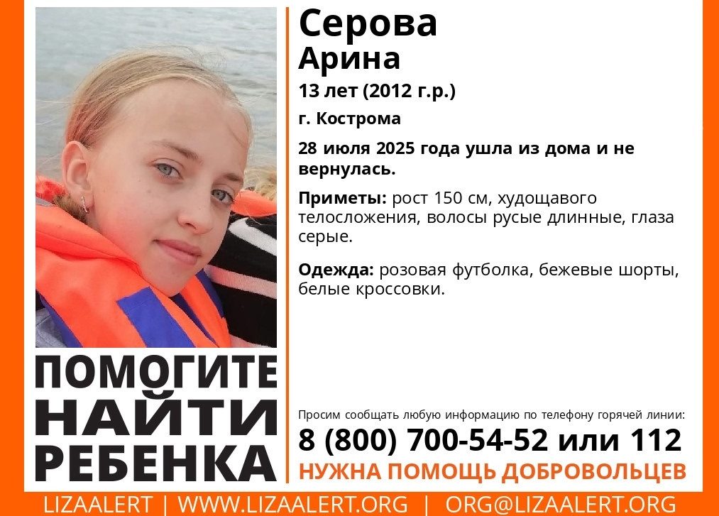 Поисковый отряд «ЛизаАлерт» сообщил о пропаже 13-летней девочки в Костроме.