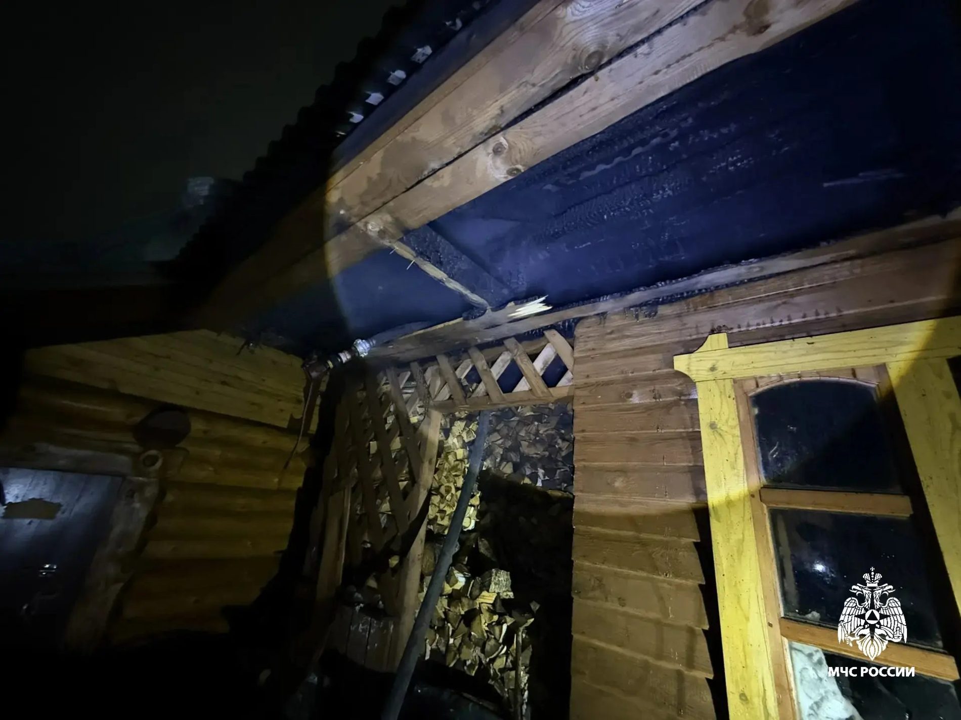 В 11 вечера спасатели МЧС России полностью ликвидировали пожар. Огнём повреждена деревянная обрешетка хозяйственной постройки с дровяником на площади 36 кв.м.