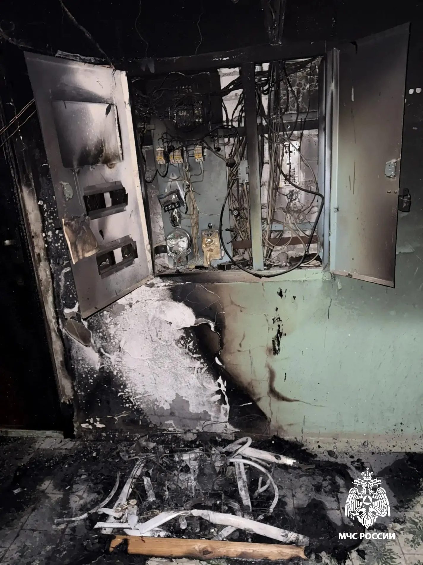 Спасатели полностью все потушили за полчаса. Огнём уничтожена детская коляска, повреждена обшивка входных дверей трех квартир, закопчены стены, потолок лестничного марша с третьего по седьмой этаж второго подъезда дома.