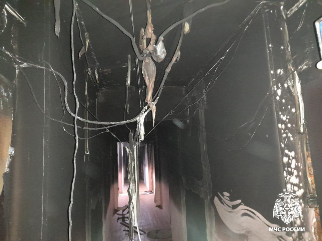Огонь уничтожил детскую коляску, оконную раму, также повреждены пол и потолок в общем коридоре на втором этаже.