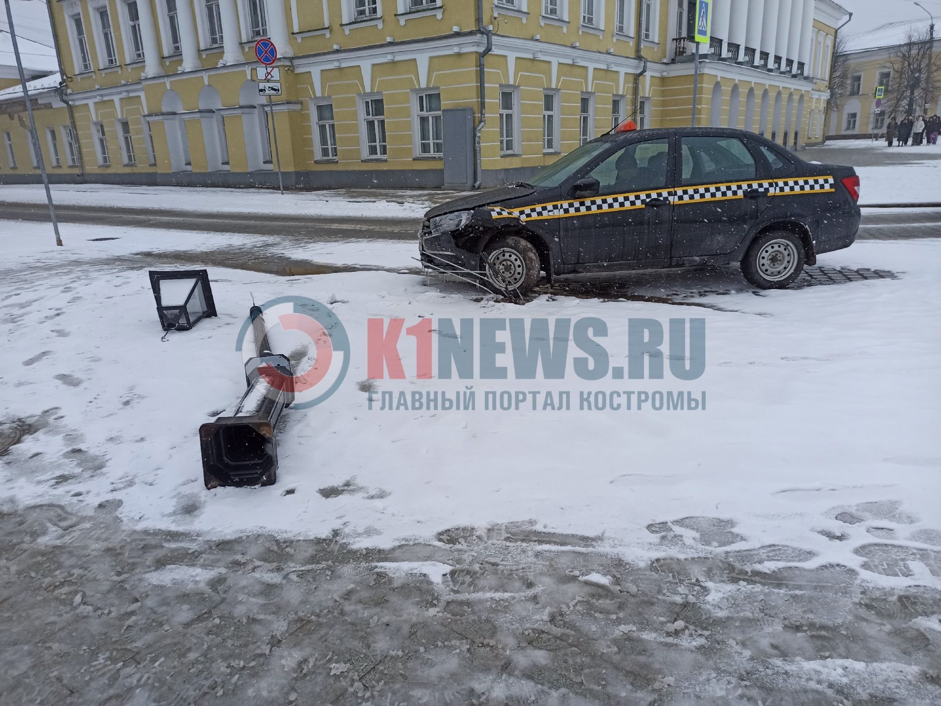 Водитель одной из городских фирм такси не справился с управлением и врезался в фигурный фонарь, стилизованный под старинный. Вероятнее всего, таксист уже поменял на машине резину на летнюю, и она не справилась со скользкой дорогой. От полученного удара столб сначала критически накренился, а потом и совсем рухнул. К счастью, из людей никто не пострадал.