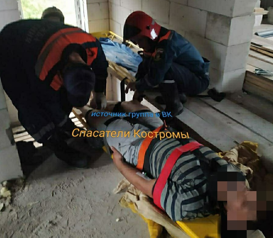 Селянин повредил кости таза. Врачи скорой не могли добраться к пострадавшему на второй этаж строящегося дома. Туда отправилась группа спасателей ОГБУ «Пожарно — спасательная служба Костромской области» ПСО№1 г.Кострома.