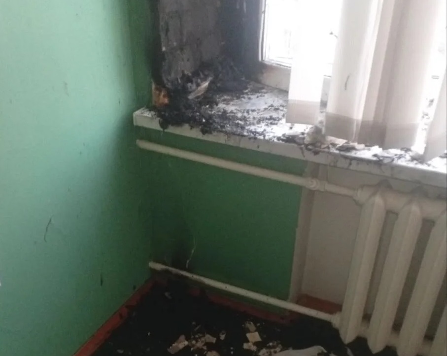 Огнем повреждена внутренняя отделка окна и пластиковая рама оконного проёма в актовом зале.