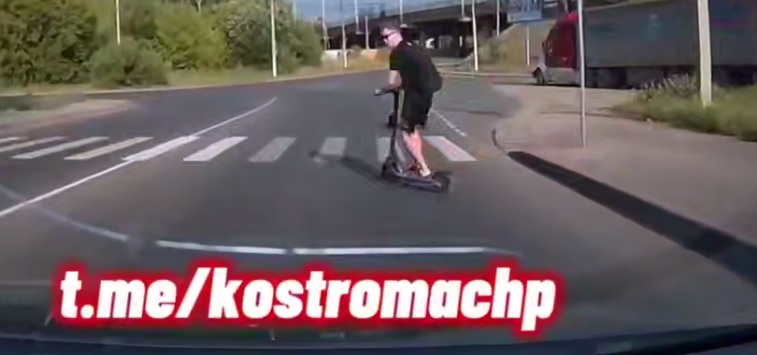 Самокатчик далеко не подросткового возраста преспокойно катил по тротуару на кольце. Ничто не предвещало беды, как вдруг гражданин неожиданно изменил направление — и выскочил на дорогу прямо перед приближающейся к пешеходному переходу машиной!