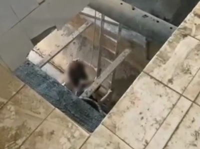 Сотрудник МЧС спустился в провал, обвязал мужчину спасательной веревкой и помог ему подняться.
