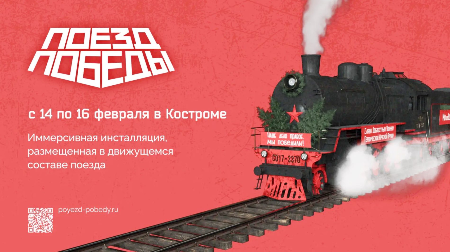 «Поезд Победы» будет доступен на железнодорожном вокзале Костромы с 14 по 16 февраля. Посещение открыто для всех желающих. Бесплатные билеты можно оформить на портале поездпобеды.рф.