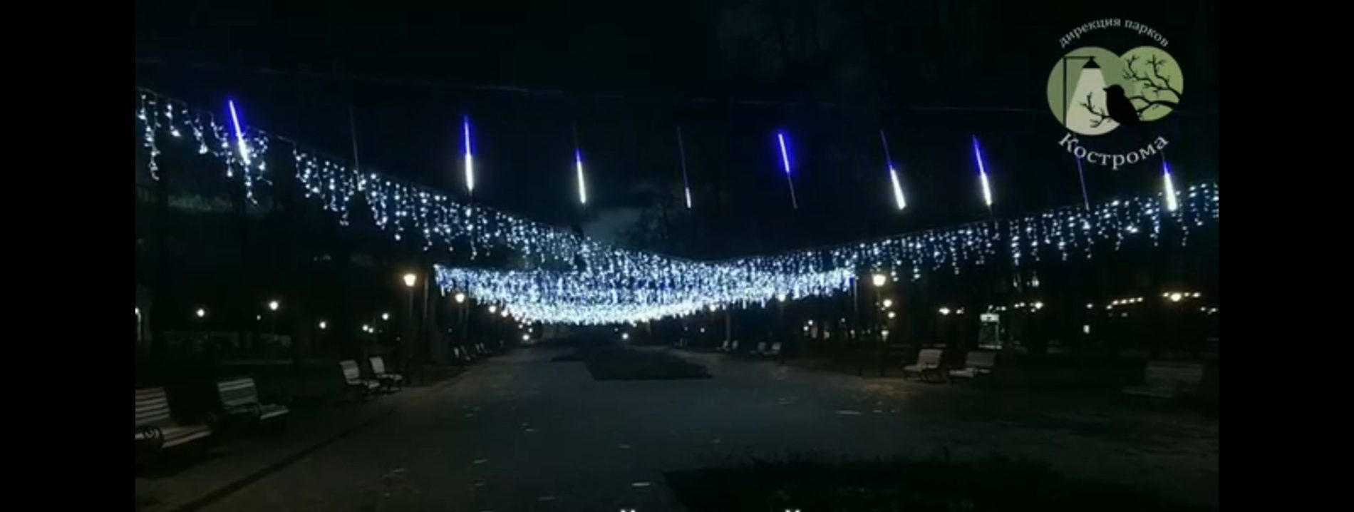 Первые праздничные украшения появились в Центральном парке. По всему периметру общественного пространства развесили светодиодные гирлянды. Там из иллюминации создали некое подобие неба.