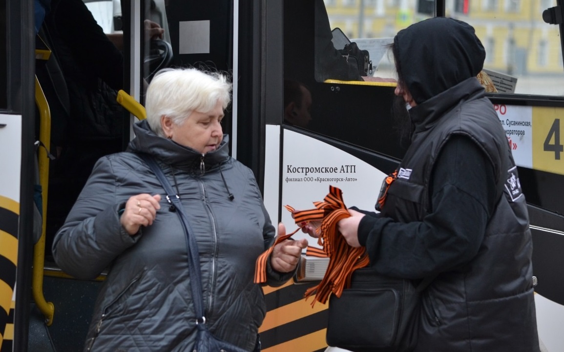 Они не только ловили «зайцев», но и поздравляли костромичей на крупных остановочных пунктах и в автобусах, вручая пассажирам георгиевские ленточки.