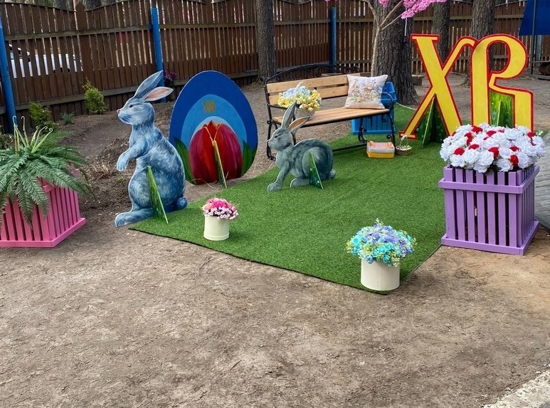 Мария и Владимир Горяевы, Мария Серяк, художник Михаил Красин и резчик по дереву Николай Масленников прекратили территорию возле церкви в настоящий пасхальный рай, наполненный символикой праздника.