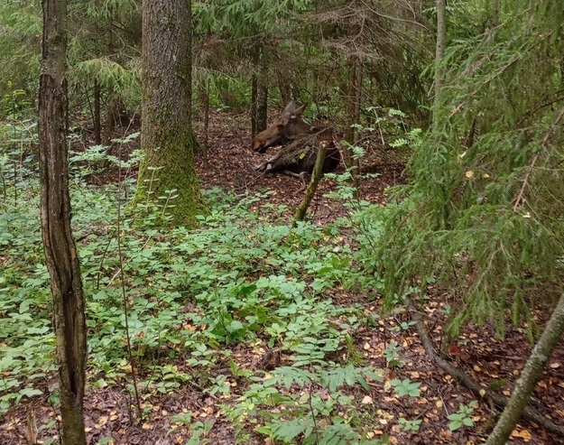 Мужчина во время тихой охоты буквально наткнулся на лосиху, отдыхавшую в чаще.