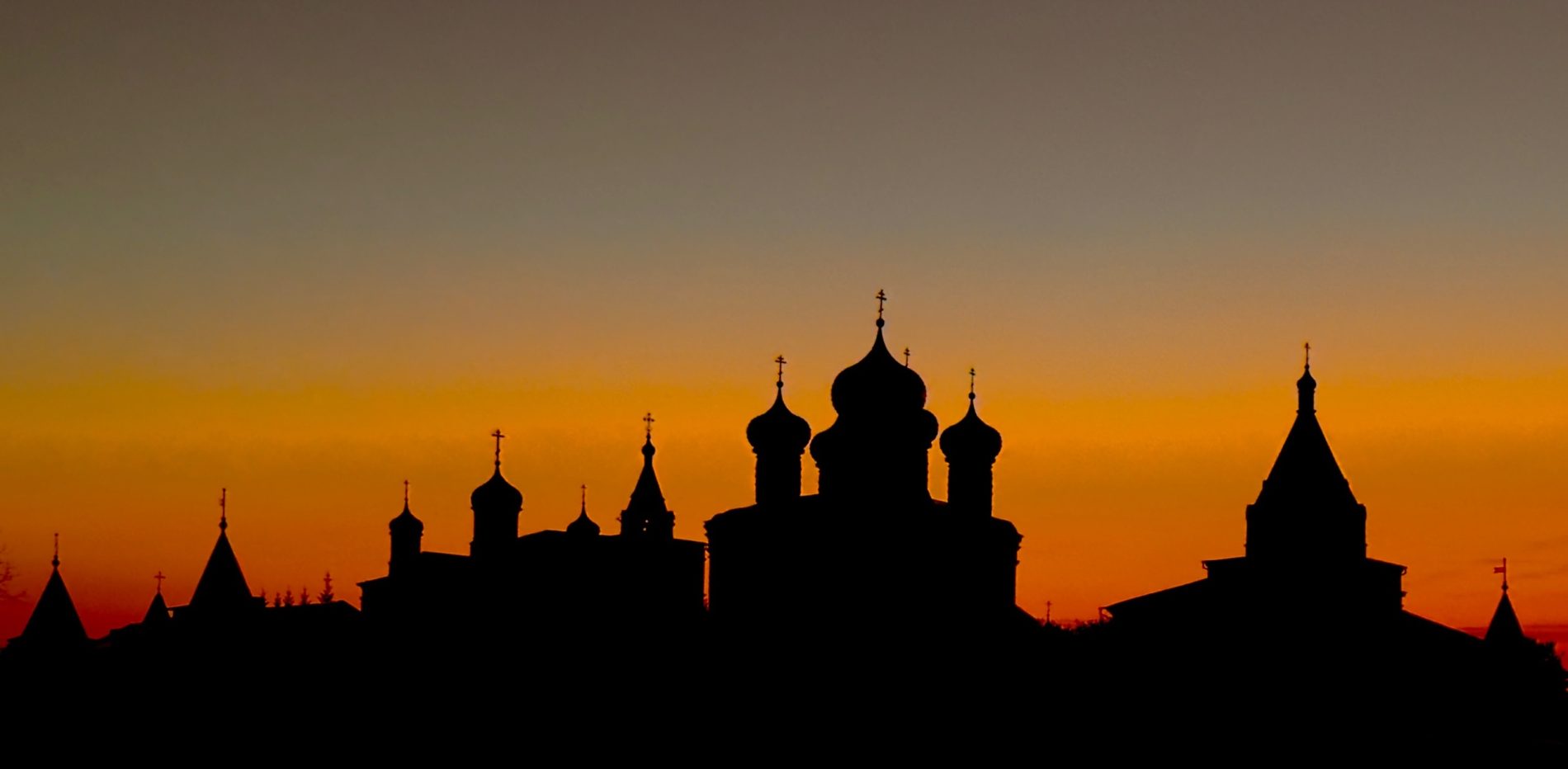 На фотографии — маковки церквей на фоне уходящего солнца. Небо окрашено в оранжевые тона. Наши святыни отличаются от арабских мечетей, но за счет такого фона, есть ощущение, будто попал в мультфильм «Аладдин». И ночь в Аграбе вот вот начнется.