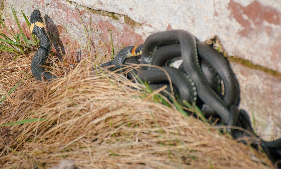 Почти летнее солнце выманило погреться целый коллектив проснувшихся змей.