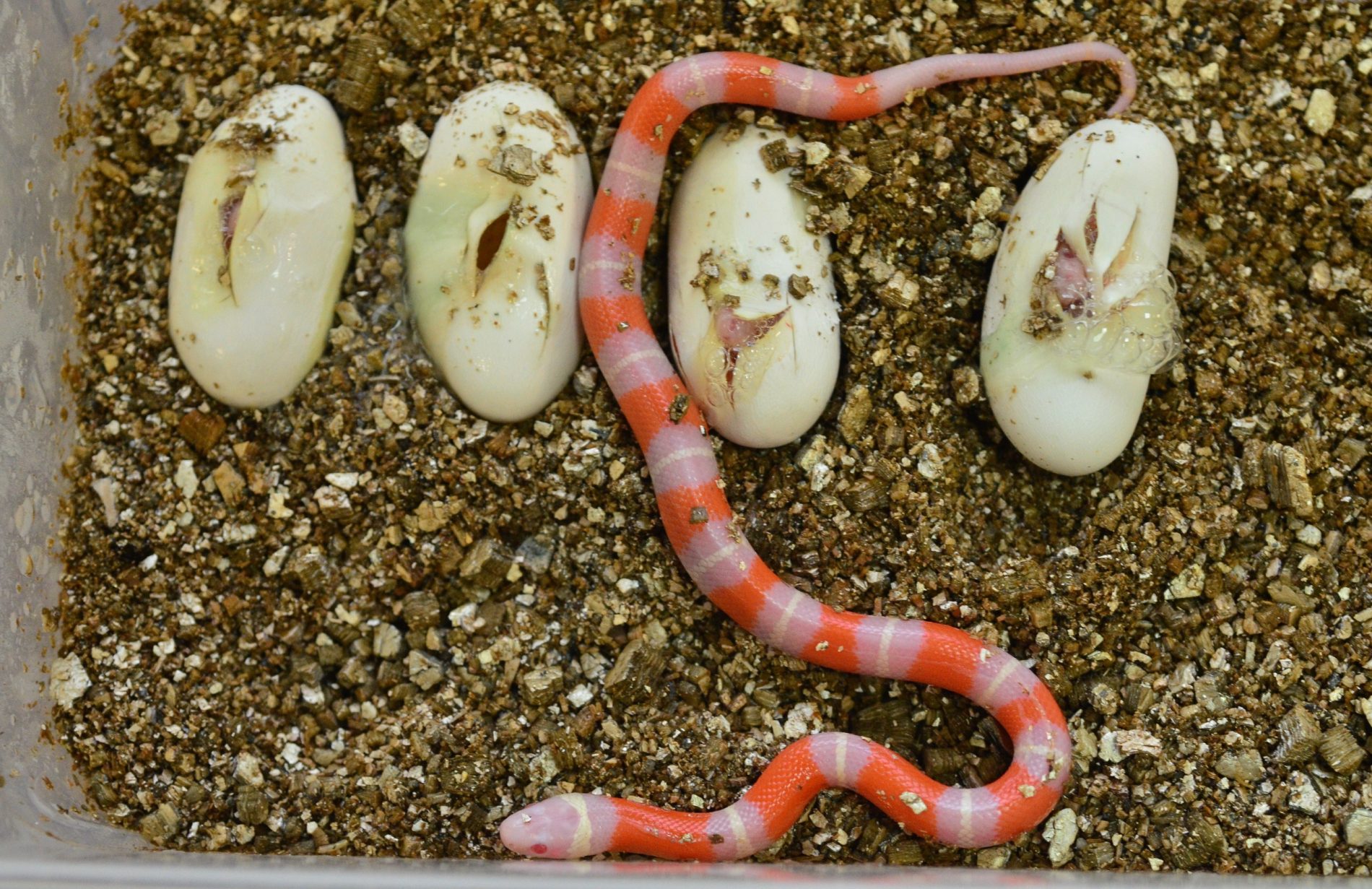 В Костромском экзотариуме пополнение — на свет появились яркие змейки. Из-за из примечательного бело-рыжего окраса сотрудники назвали малышей «крабовыми палочками».