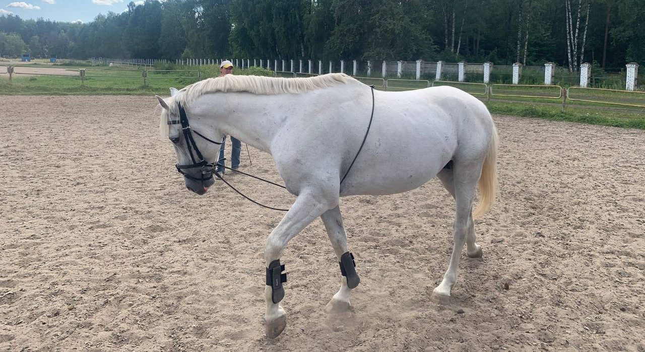 Светло-серый жеребец по кличке Зевс уже изучает окрестности нового дома — конюшню в Костромской конно-спортивной школе.