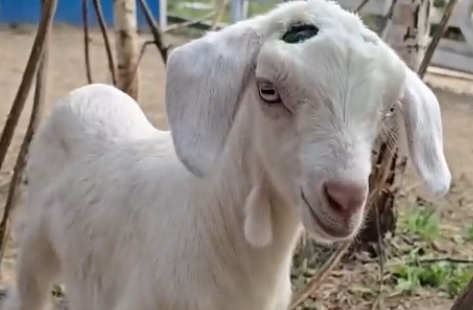 Нубийская коза Лина родила очаровательного козлёнка — такого же беленького, как мама, и с такими же симпатичными подвесами на шее.
