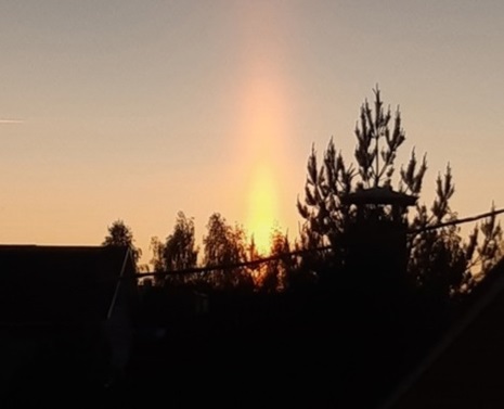 Это так называемый световой столб — разновидность гало. Такие свечи можно наблюдать на закате или на рассвете. Они возникают, когда солнечный свет отражается от ледяных кристалликов, расположенных параллельно земле.