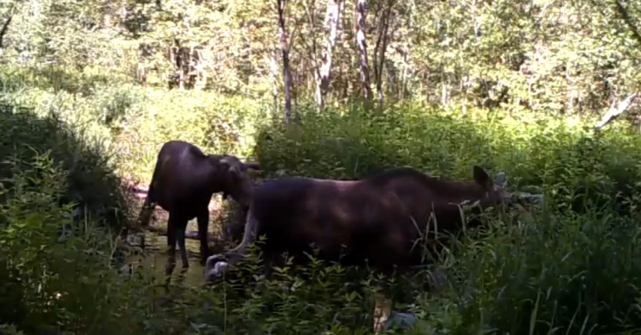 Специальная камера, установленная в глубине заповедника «Кологривский лес», засняла купание лосей в лесной речке.