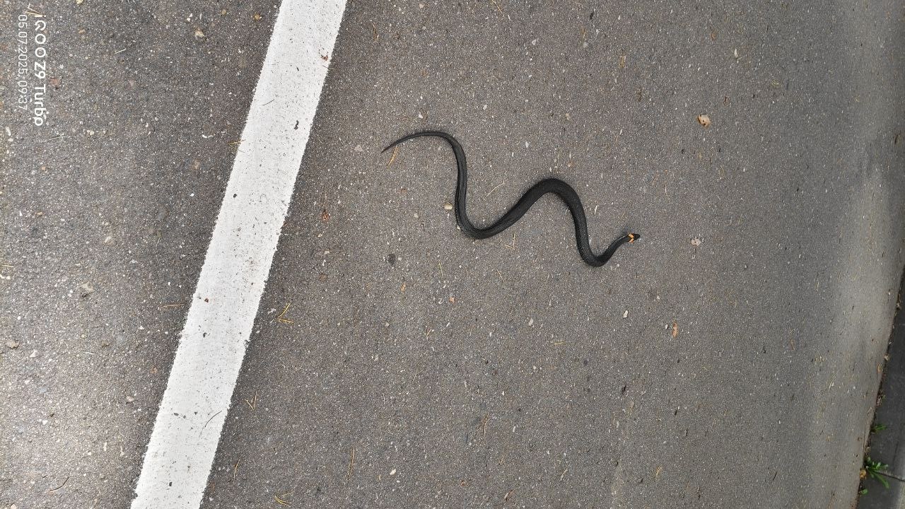 Рептилия оказалась не ядовитой: судя по характерным ярким пятнышкам на голове, это безобидный уж. Точнее, относительно безобидный: если такой хищник цапнет, можно запросто получить заражение крови. Нежелательно также целоваться даже с неядовитыми змеями, обнаруженными в лесу: практически все они заражены паразитами, в том числе опасными для человека.