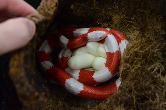 Молодая мамаша — похожая на крабовые палочки молочная змея Нельсона (Lampropeltis triangulum nelsoni).