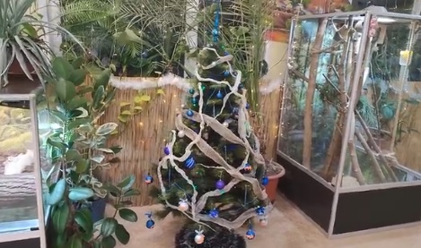 Очешуительными гирляндами в зоопарке экзотических животных украсили маленькие елочки.