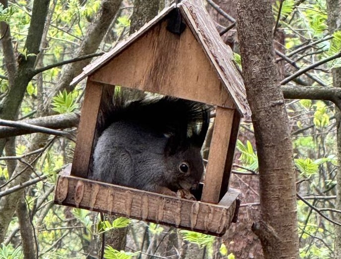 В Берендеевке же посетители заметили белочку. Хоть зима уже и позади, пушистая красотка не прочь полакомиться содержимым кормушки.