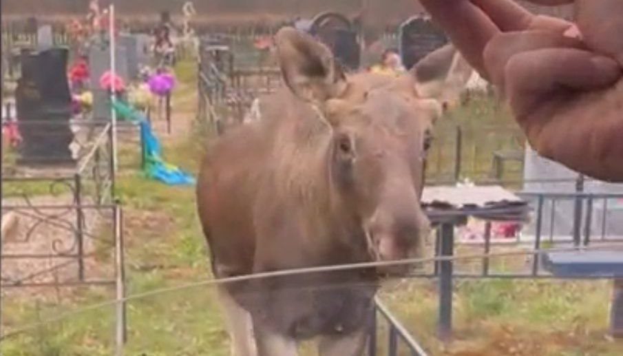 Сохатый спокойно разгуливал среди могил и даже не боялся окружающих людей. Более того: когда местный житель решил угостить животное, зверь бесстрашно подошел к машине.