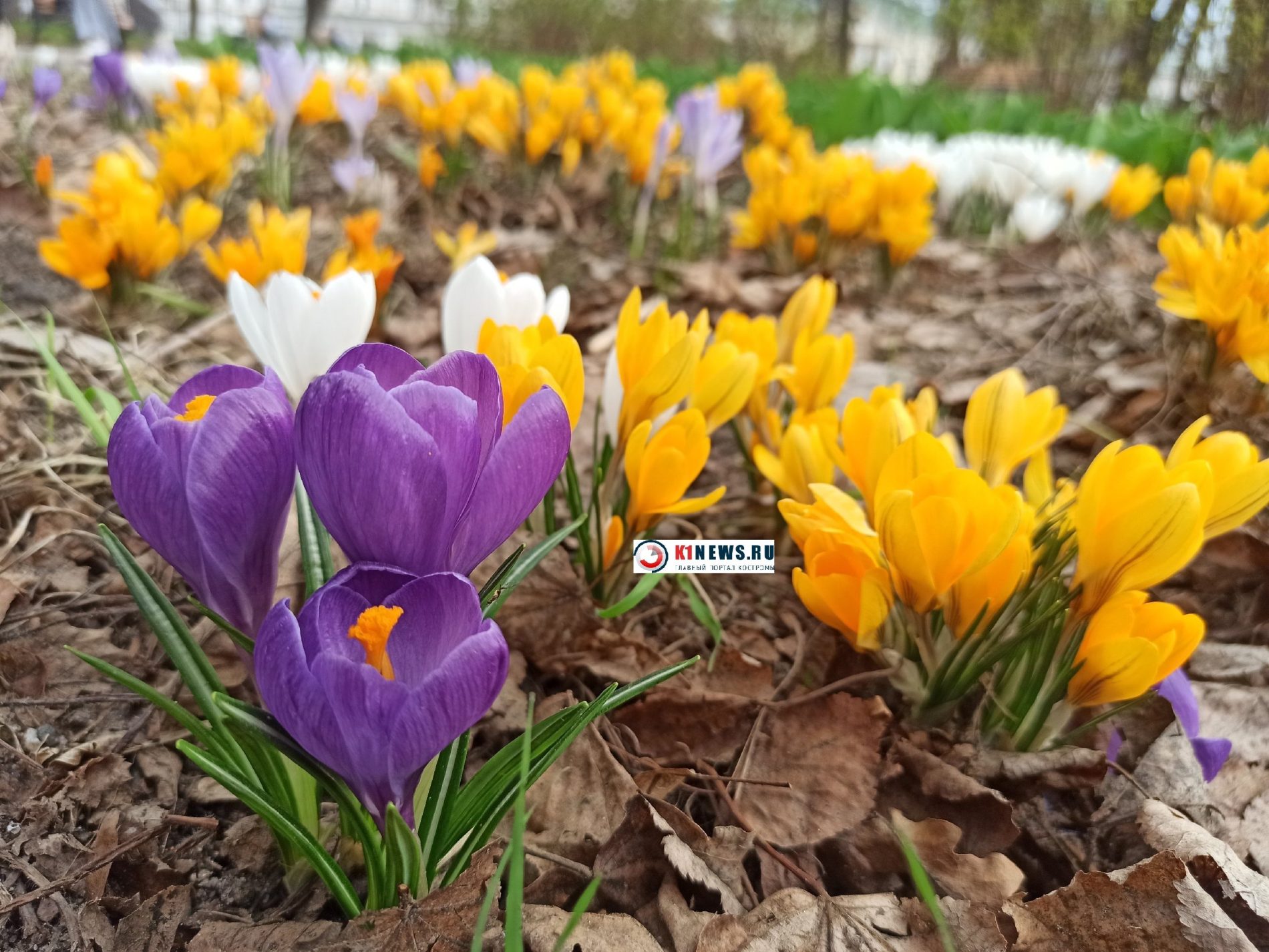 На парковых клумбах сейчас бурное цветение первоцветов. Оранжевые, фиолетовые и белые цветы пестрят на фоне Костромского кремля и радуют прохожих.