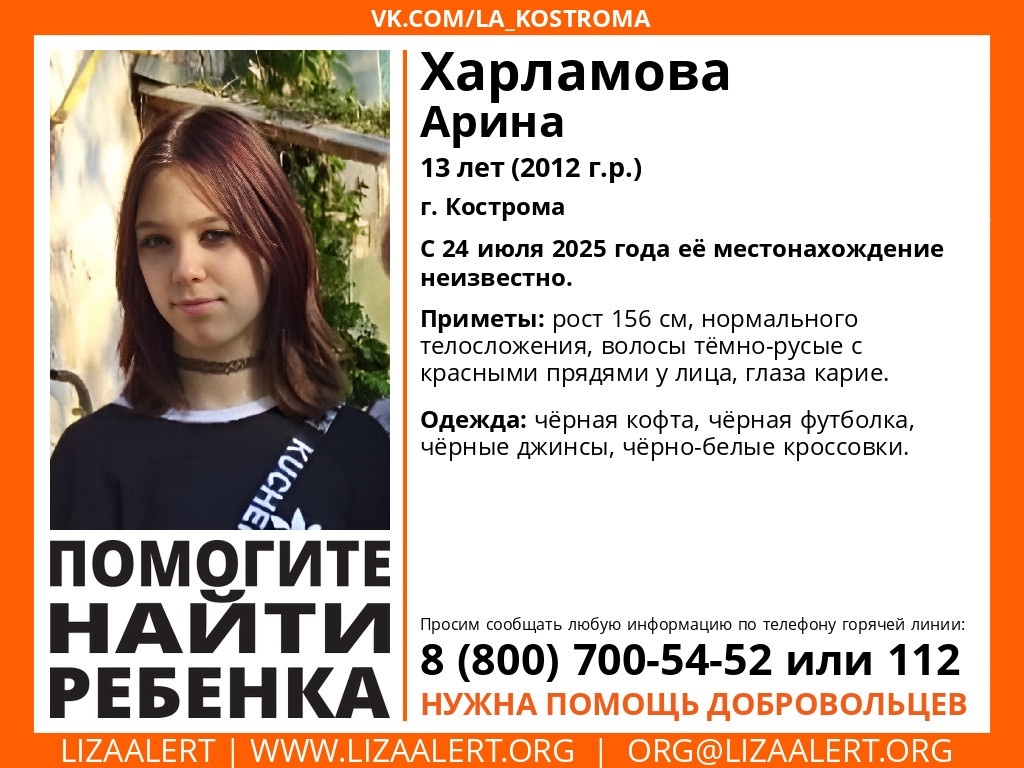 Если у вас есть какая-либо информация о местонахождении Арины Харламовой, позвоните по тел.: 8-800-700-54-52 или 112.