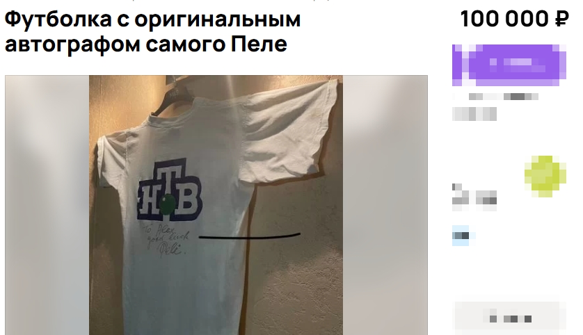 Продавец рассказал, что в 2003 году, когда футболист приезжал в Москву на ток-шоу «Принцип Домино», ему удалось взять у спортсмена автограф. Пеле расписался на белой футболке с логотипом канала «НТВ», оставив фразу: