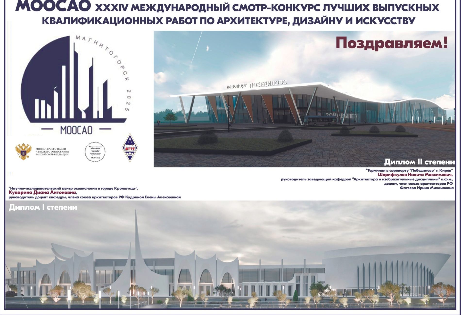 Дипломом II степени отмечена ВКР Никиты Шарифкулова «Терминал в аэропорту “Победилово” г. Киров». Руководитель — завкафедрой «Архитектура и изобразительные дисциплины» к.ф.н., доцента, члена союза архитекторов РФ Фатеева Ирина Михайловна.