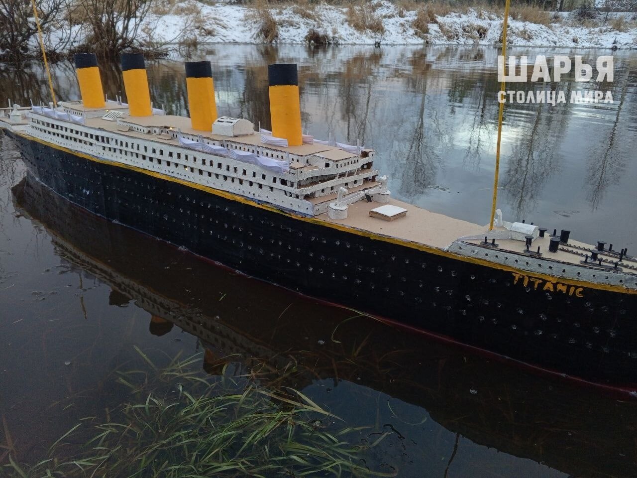 Поздней осенью на фоне заснеженных берегов речки искусно сделанная модель трансатлантического лайнера выглядит очень эффектно.